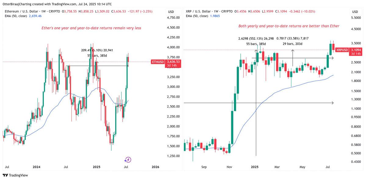 XRP在过去一年中明显跑赢ETH。自2024年7月以来,XRP上涨了552%,而ETH仅录得6.34%的温和增长,从3,432美元上涨至3,630美元。今年至今(YTD)的表现也突显了XRP的强势,该代币从2.08美元上涨至3.10美元(增长49%),相比之下,ETH在同期仅上涨了9.5%。