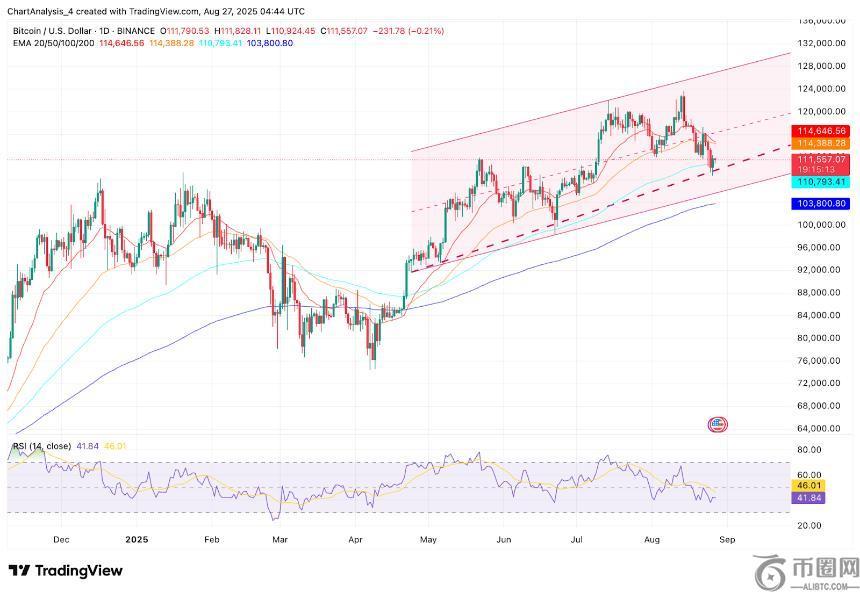 日线图上,BTC守住了上行通道的下轨,锚定在110,800-111,000美元附近。该水平也与100日均线(EMA)110,793美元的水平一致,为多头提供了技术缓冲。
