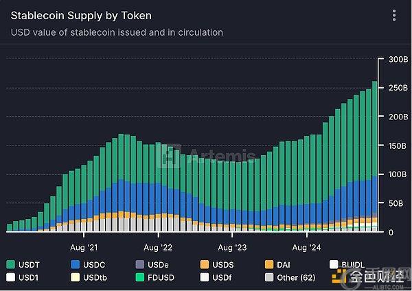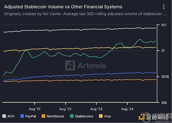 • 交易量超越支付巨头:2024 年9月起稳定币单日交易额持续超过VISA通道的交易量,甚至一度达到 5.1 万亿美元的峰值。