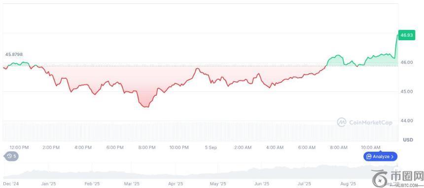 CoinMarketCap 数据显示 Hyperliquid 的当前交易状态。截至最新更新,HYPE 的交易价格为 46.74 美元,市值约为 156.1 亿美元。其 24 小时交易量为 1.9769 亿美元,下跌 7.64%。过去 90 天,价格上涨了 37.50%,展现出其市场韧性。