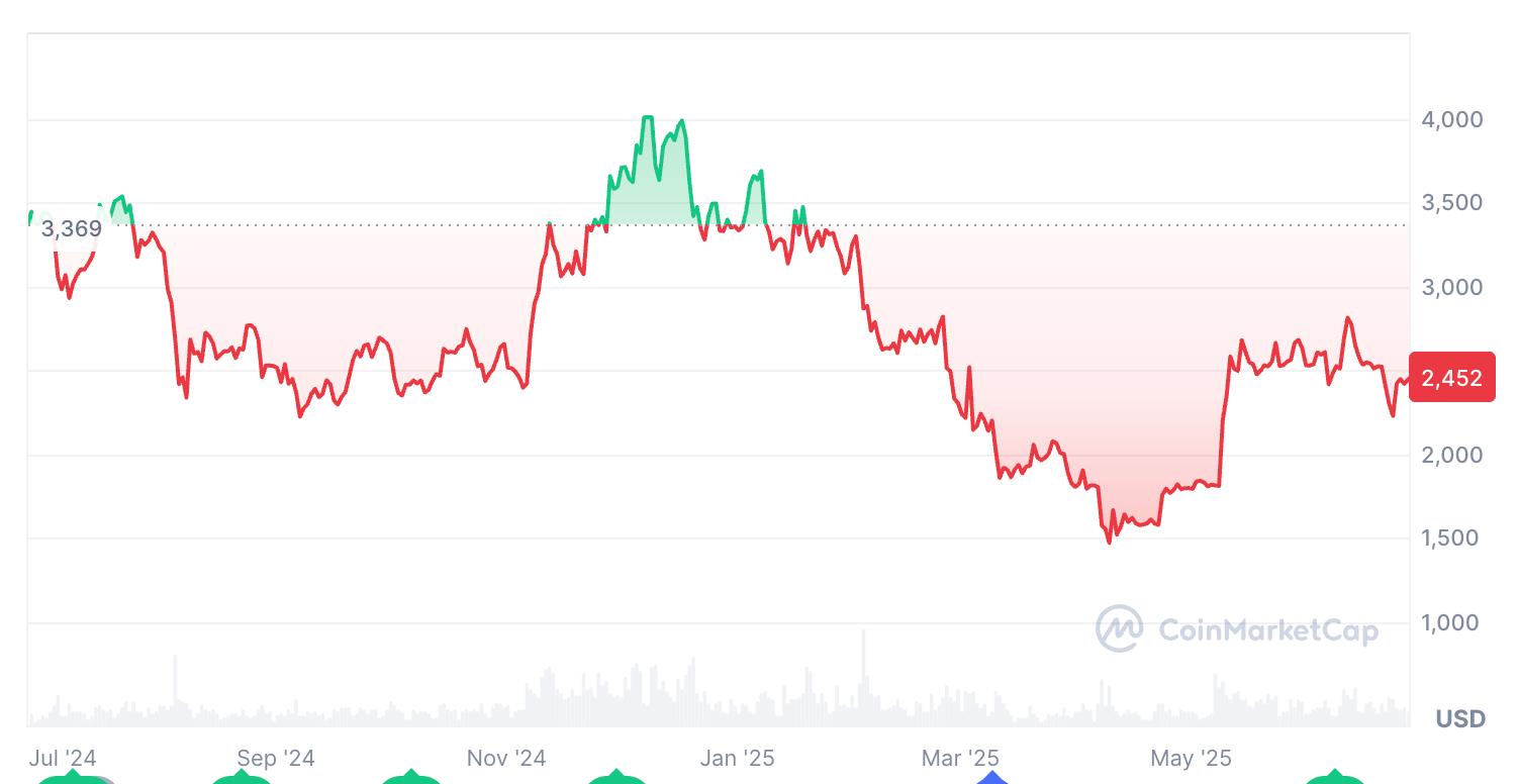 根据CoinMarketCap的数据,截止发文时,以太坊的交易价格为2452美元,过去30天下跌了7.45%。