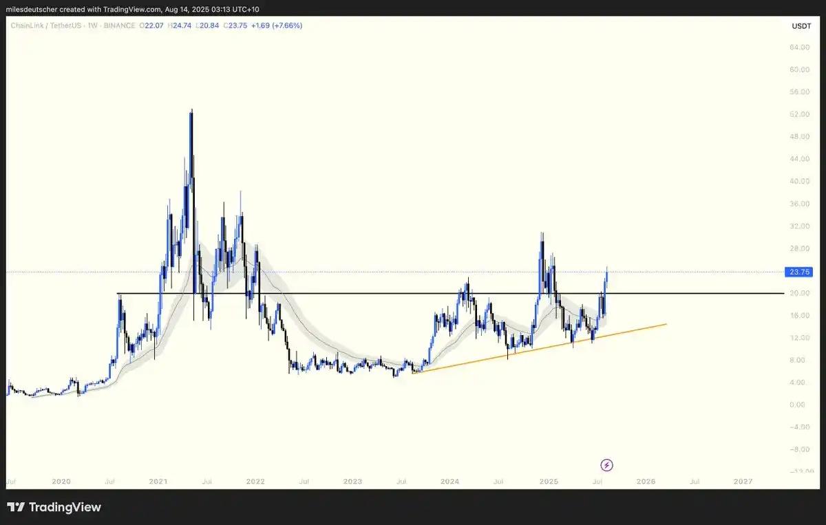 从技术图表上看,$LINK 已经突破了 20 美元的周线级别阻力区。这个价位多年来一直是一个重要的多空转换点,其重要性基本上相当于 ETH 的 4000 美元水平。