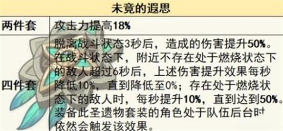 2、四件套效果:脱战3秒后,提升50%攻击力,处于战斗状态下,附近没有处于燃烧状态下的敌人,上述伤害提升每秒会降低10%直到降低至0%,若存在处于燃烧状态下的敌人时,装备者的伤害每秒提升10%直至提升至50%。