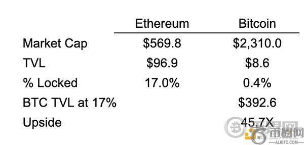相比之下,比特币的收益似乎才刚刚起步。以太坊的TVL相当于以太坊市值的17%,而比特币的TVL仅为比特币市值的 0.4% 左右(根据DeFi Llama数据):