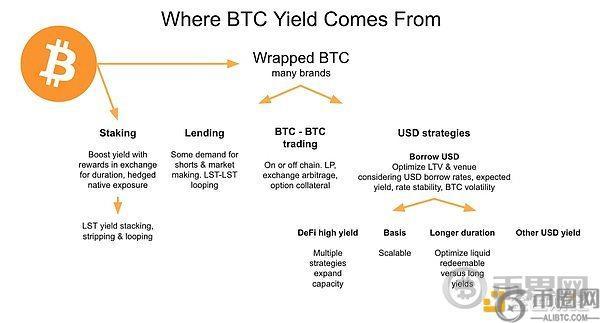 质押提供以比特币计价的收益,这些收益来自使用比特币作为验证抵押品的区块链和质押网络。质押比特币通常被宣传为具有高安全性,可以直接锁定在比特币链上。这是一个新想法,但吸引力不大,部分原因是目前收益率仅为1%左右。然而,如果结合长期持有或持有非比特币协议代币的代币奖励,收益率可能会更高。