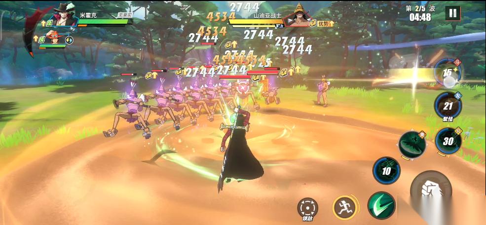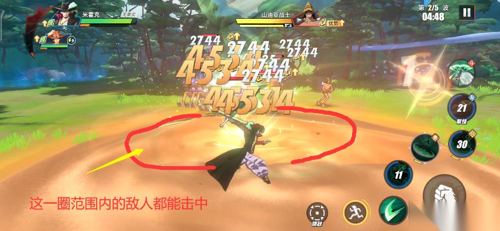 实战中,只要BOSS瓦帕登场,我们就利用鳄鱼助战技能将所有敌人聚集起来,接着直接使用鹰眼的究极奥义。所有敌人被击倒之后,我们在释放鹰眼连招,这样就可以无伤输出。前面我们积攒的能量可以在这里一起释放了,鹰眼连招打完,立刻丢出普通奥义,接着替换艾斯远距离再消耗一套。