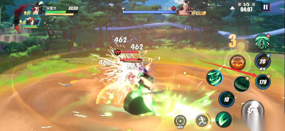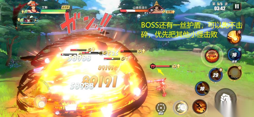 除了上面提到的等所有敌人登场后再集中输出之外,大家也可以一波一波的输出,不过这里需要大家使用奥义,并且要双伙伴搭配使用才可以击败每一波的敌人。看起来难度是降低了,实际上效果反而没有上面的好,而且战力不足的玩家,每一波根本秒不掉,不仅释放了奥义,连血量都不一定能保住。