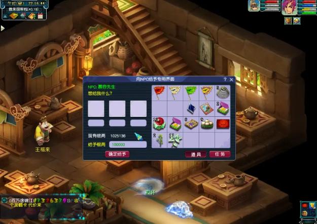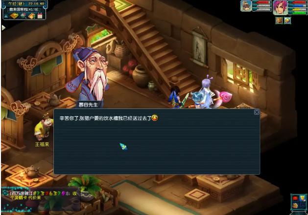 任务三:最后我们来到傲来国(182.27)附近,傲来客栈内找到慕容先生制作饮水槽,这里慕容先生会向我们索要一些海产品,现在钓鱼的人比较少,白白还是建议直接给梦幻币,毕竟收这些物品也需要花费一些时间,只是十万梦幻币,也不是很多,直接给他吧!